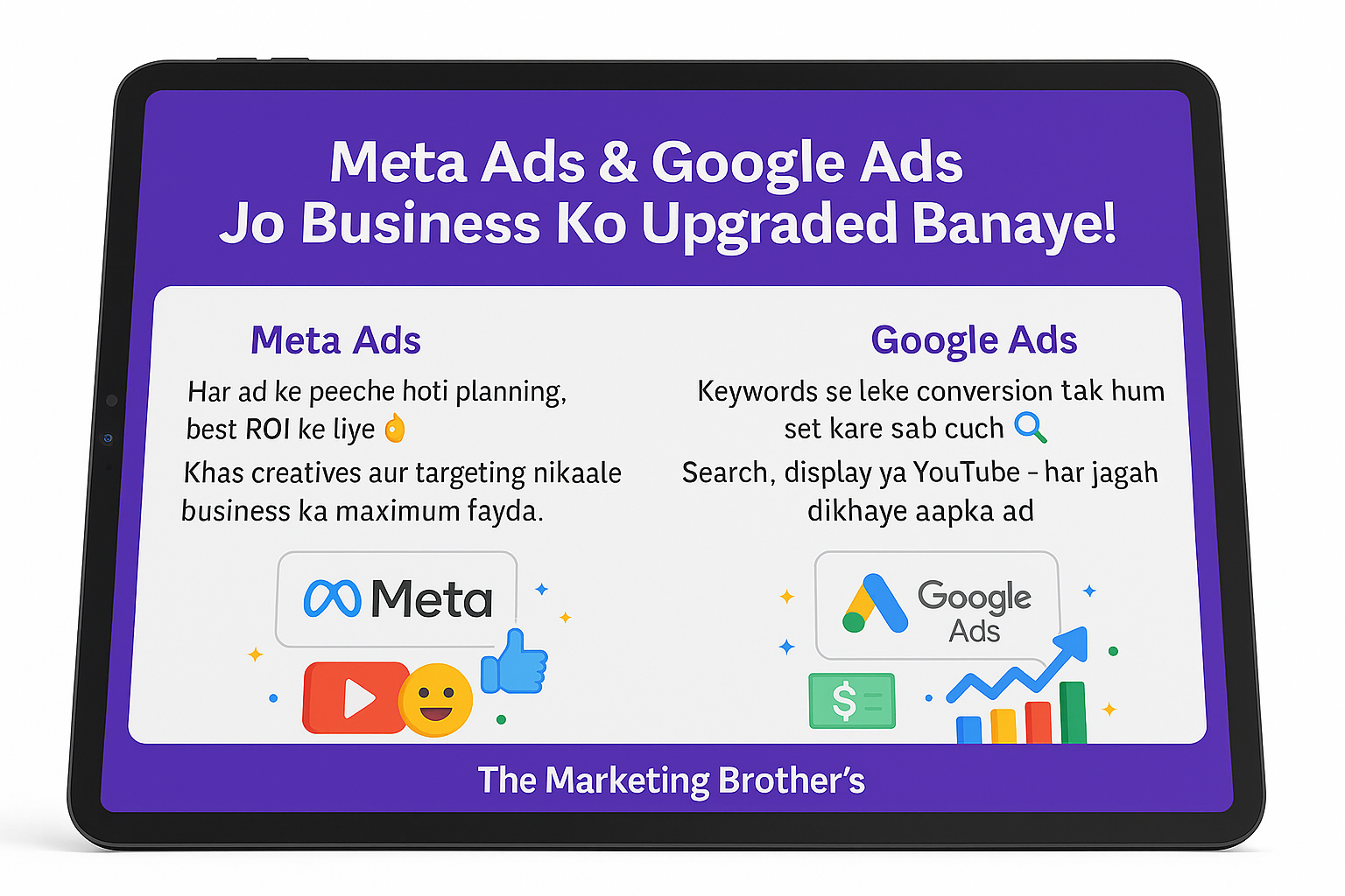 Meta ya Google Ads ho – hum dete hai result, na ki sirf reach. Har campaign full planning ke saath hota hai, ROI guaranteed.